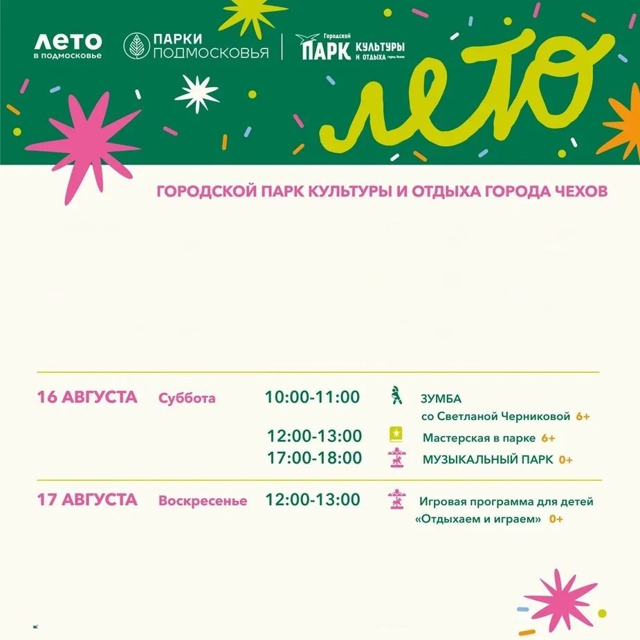 ✨ Выходные в Городском парке В СУББОТУ ждём на зумбу 👯, мастерскую в парке ✂️ и с 17:00 до 18:00 на музыкальный парк 🎼 В ВОСКРЕСЕНЬЕ ждём на детскую игровую программу 🏢 Городской парк культуры и отдыха 📍 г. Чехов, ул. Пушкина, д.1 🪙 Вход свободный❗️ ⭐Разместить публикацию ⭐Поддержать канал голосом ✅ Мероприятия Чехов https://dzen.ru/id/66cc4b48e9ef144699238a51 http://vk.com/chekhov_events http://dzen.ru/chekhov_events