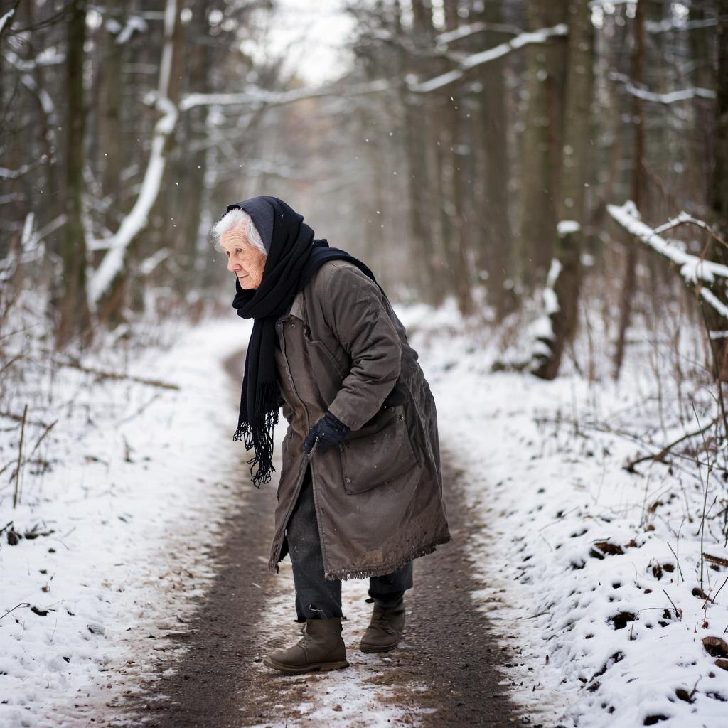 Они обернулись — и увидели её. Она стояла в снегу, прямо за их спинами, хотя никто не слышал, как она подошла. Её лицо было бледным, почти серым, глаза — чёрные, как смоль. Ветер не шевелил её платок, будто она не была частью этого мира.