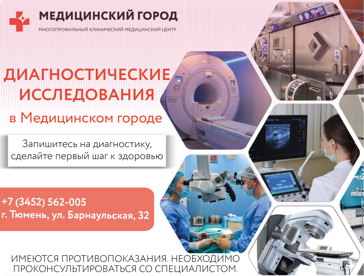 Точная диагностика важна для вашего здоровья. Именно поэтому Медицинский город предлагает широкий спектр диагностических исследований, которые помогут выявить заболевания на ранних стадиях и начать эффективное лечение. Запишитесь на диагностику уже сегодня и сделайте первый шаг к здоровью! Об услугах , предоставляемых ГАУЗ ТО "МКМЦ "Медицинский город", вы можете узнать на нашем официальном сайте или по телефону: +7 (3452) 562-004 (единый колл-центр). Записаться на приём к врачу можно с помощью виртуального помощника.