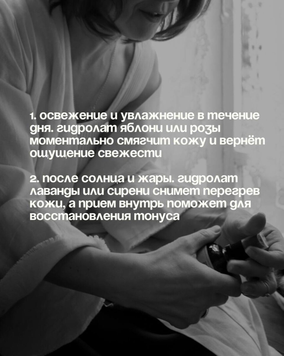 Большинство воспринимают гидролат как тоник, но это не всё! Поэтому вот 10 идей, как превратить один флакон в маленький домашний спа и поддержку здоровья одновременно 👉🏻 И самое главное: наши гидролаты — пищевые, 100% натуральные и без консервантов! Это значит, что вы можете не только ухаживать за кожей, но и принимать их внутрь для оздоровления. Представьте: уход и здоровье в одном флаконе. Десятки способов заботы о себе каждый день с одним универсальным продуктом! 🤍