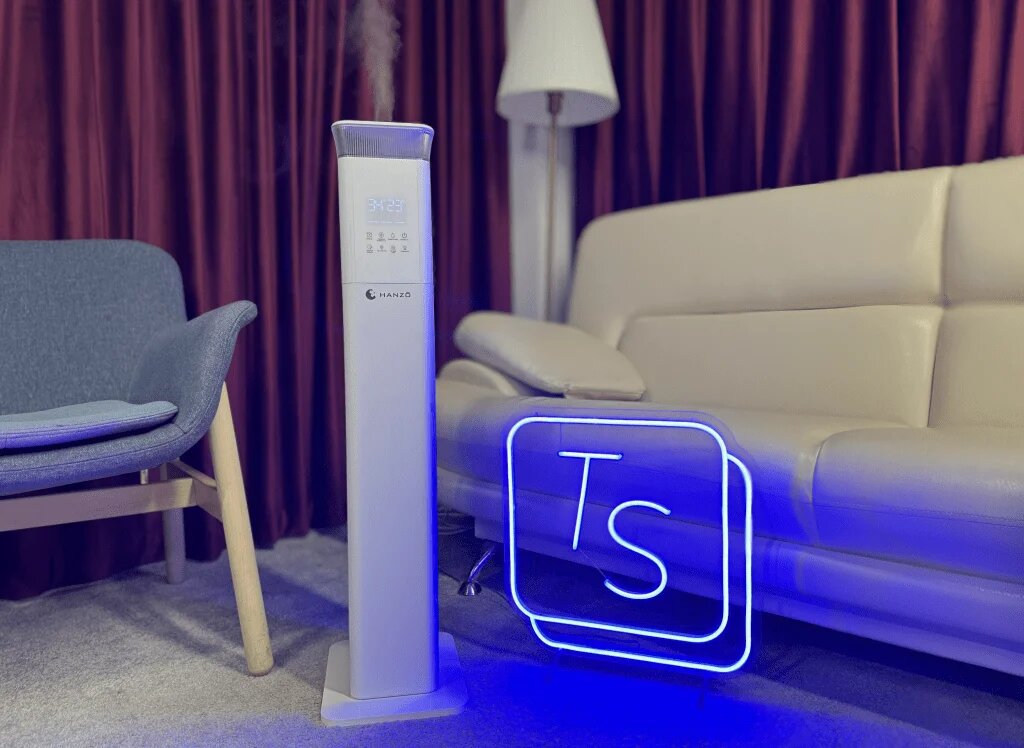 Дизайн — первое, что цепляет взгляд. Hanzo Z40 легко спутать со стильным элементом декора, например, с лампой. Минимализм здесь не скучный, а продуманный. При габаритах 83,5 см и объёме резервуара 13 литров ожидаешь громоздкий «ящик», а видишь изящную башню — что-то среднее между античной колонной и небоскрёбом Москва-Сити. Кому-то устройство напомнит греческую классику, кому-то навеет мысли о Древнем Риме во время вечернего отдыха. Для создания атмосферы увлажнитель подходит идеально — особенно с парой капель аромамасла. Но об этом позже, а пока взгляните, как модель выглядит в темноте. Правда, впечатляет?