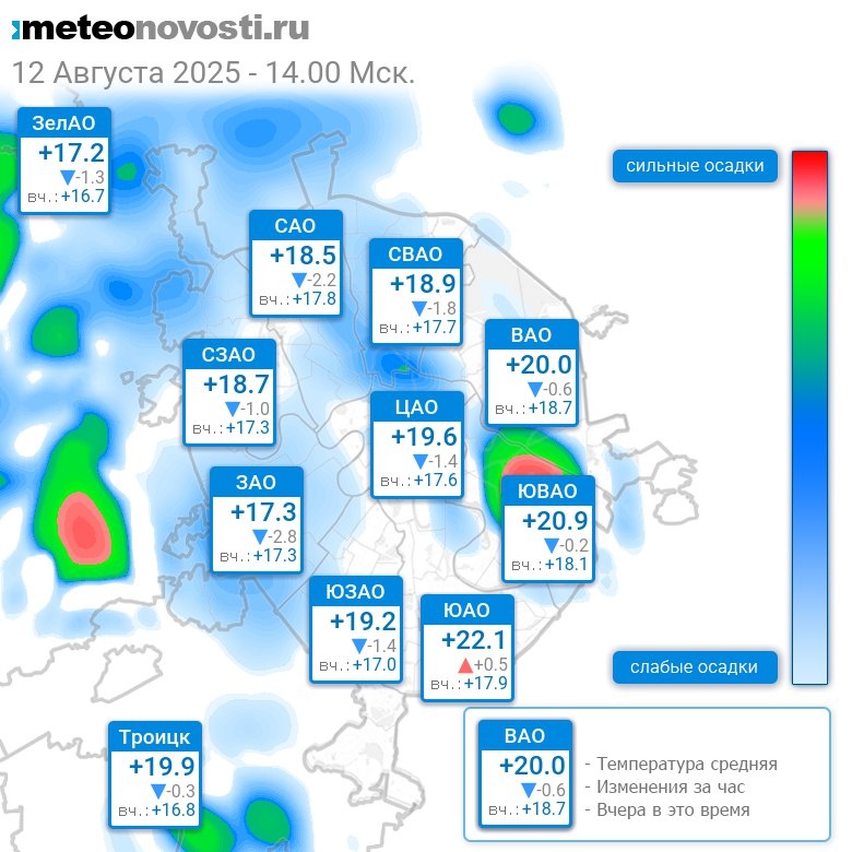 В 14:00 в Москве было от +16.3°C до +23.2°C, средняя температура +19.5°C #погода #Москва #лето #температура #12августа #вторник