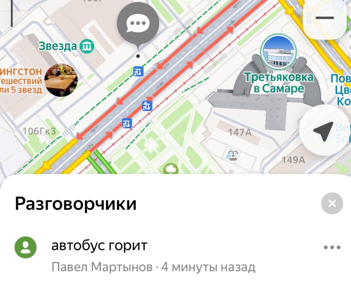 ❗️❗️❗️❗️❗️❗️В Самаре около КРЦ «Звезда» горит автобус О ЧП сообщают очевидцы. Инцидент сильно осложнил дорожное движение в обе стороны. По данным приложения Яндекс Карты, территория рядом с самарской Третьяковской галерей окрасилась в багровый. 📸: Яндекс Карты