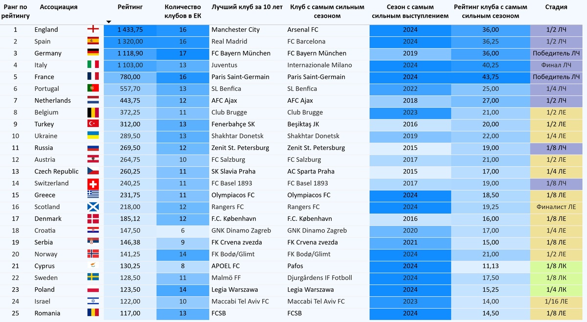 Рейтинг ассоциаций по заработанным клубами рейтинговых баллов УЕФА с 2015 по 2025 годы возглавляет Англия с показателем в 1433,75 балла, лучший клуб – «Манчестер Сити», а рекорд по баллам у «Арсенала» с полуфиналом Лиги чемпионов в прошедшем сезоне с 36 баллами (больше матчей – больше побед – больше рейтинговых очков).