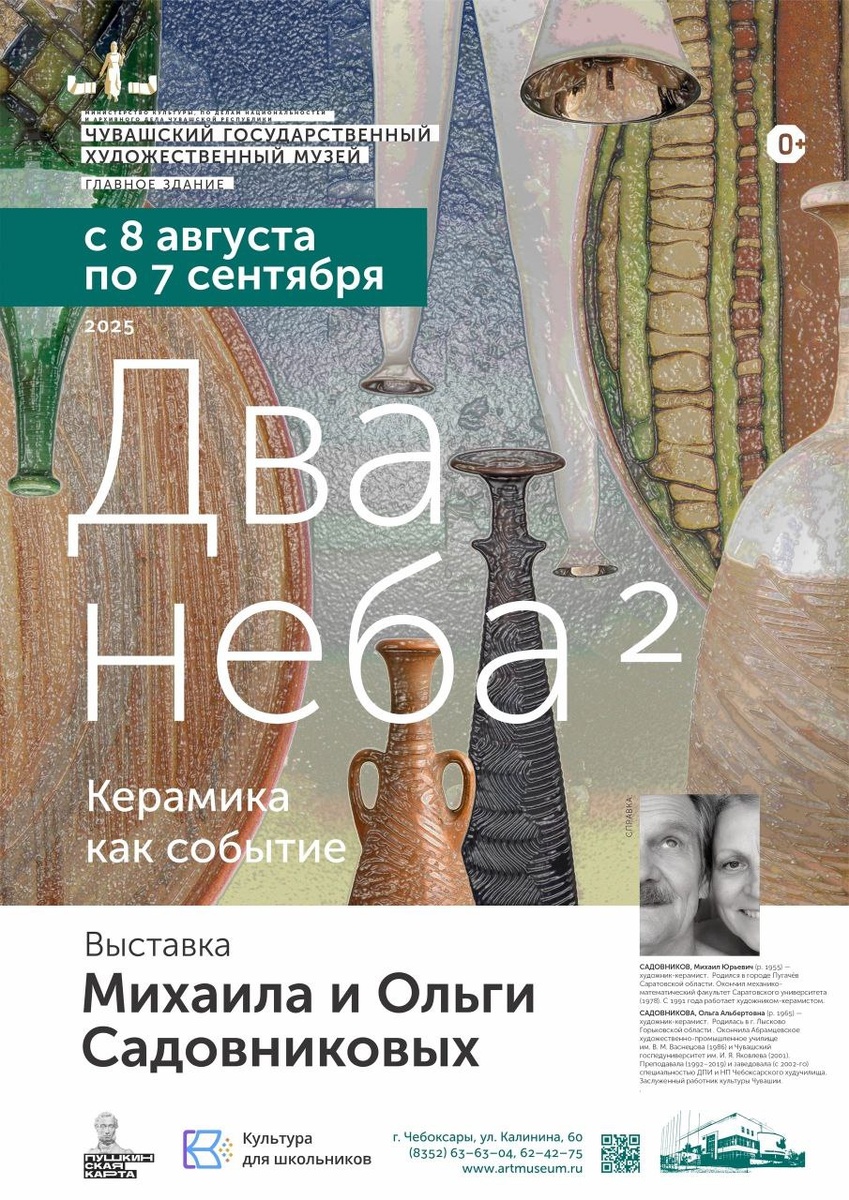 Приглашаем на авторскую экскурсию по выставке «Два неба 2»! 15 августа в 18:00 состоится уникальная встреча с художниками Михаилом и Ольгой Садовниковыми в Чувашском государственном художественном музее. Что вас ждёт? 🔸 18:00 — Авторская экскурсия. Погрузитесь в мир выставки «Два неба 2» вместе с ее создателями! Ольга и Михаил Садовниковы раскроют концепцию, поделятся историями создания работ и своими творческими замыслами. 🔸 18:45 — Вопрос-ответ и свободный диалог. У вас будет прекрасная возможность задать художникам любые вопросы о выставке, творчестве, вдохновении и художественном процессе. Не упустите возможность: • Погрузиться в мир современного искусства. • Узнать уникальные истории создания работ. • Лично пообщаться с художниками выставки Ольгой и Михаилом Садовниковыми. • Провести вечер в атмосфере музея. Присоединяйтесь! Вход - 150/200 руб. Доступна Пушкинская карта нацпроекта «Семья»: vmuzey.com/event/vystavka-sadovnikovyh-dva-neba-2