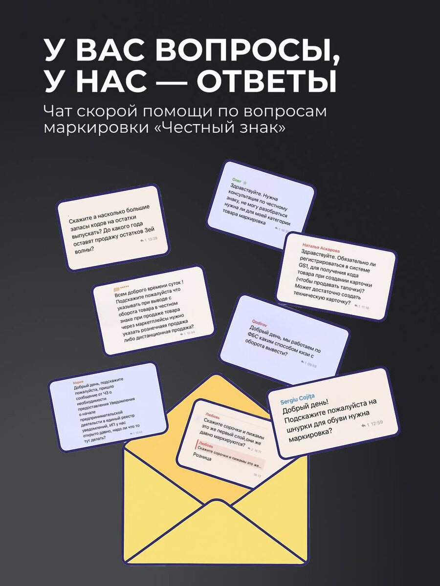 🟨 Если вы не знаете, что делать с ЧЕСТНЫМ ЗНАКОМ, маркируются ли носки, куда клеить код и как быть с остатками, то напишите в наш чат. Ежедневно мы помогаем оперативно решать сложные проблемы и оберегаем ваши бизнесы от штрафов. Поэтому здесь ваши вопросы — наши экспертные ответы👌 PS. Поделитесь этим постом со своим коллегой или партнером, который реализует маркированный товар