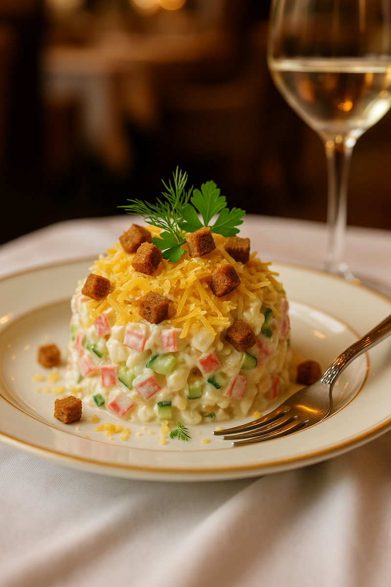Сборка: Смешанный способ лучше слоеного для этого варианта, так как нежные крабовые палочки сложно укладывать слоями, не помяв. Если делаете слоями, кладите крабовые палочки сверху (под сыр и сухарики). - Сухарики: Правило неизменно – ТОЛЬКО ПЕРЕД ПОДАЧЕЙ! Их хруст – фишка салата.