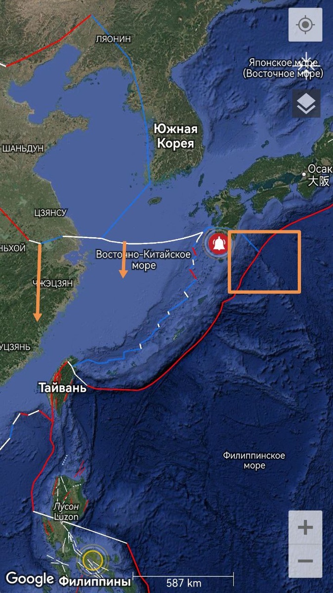Зафиксированы ОСТИ над Восточно-Китайским морем (М7) и к юго-востоку от Кюсю (М5.7+). ===== CSTIs were recorded over the East China Sea (M7) and southeast of Kyushu (M5.7+).