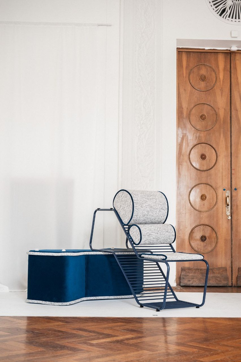 Ткань Bubbles и дизайнерское кресло с металлическим каркасом и цилиндрическими подушками.