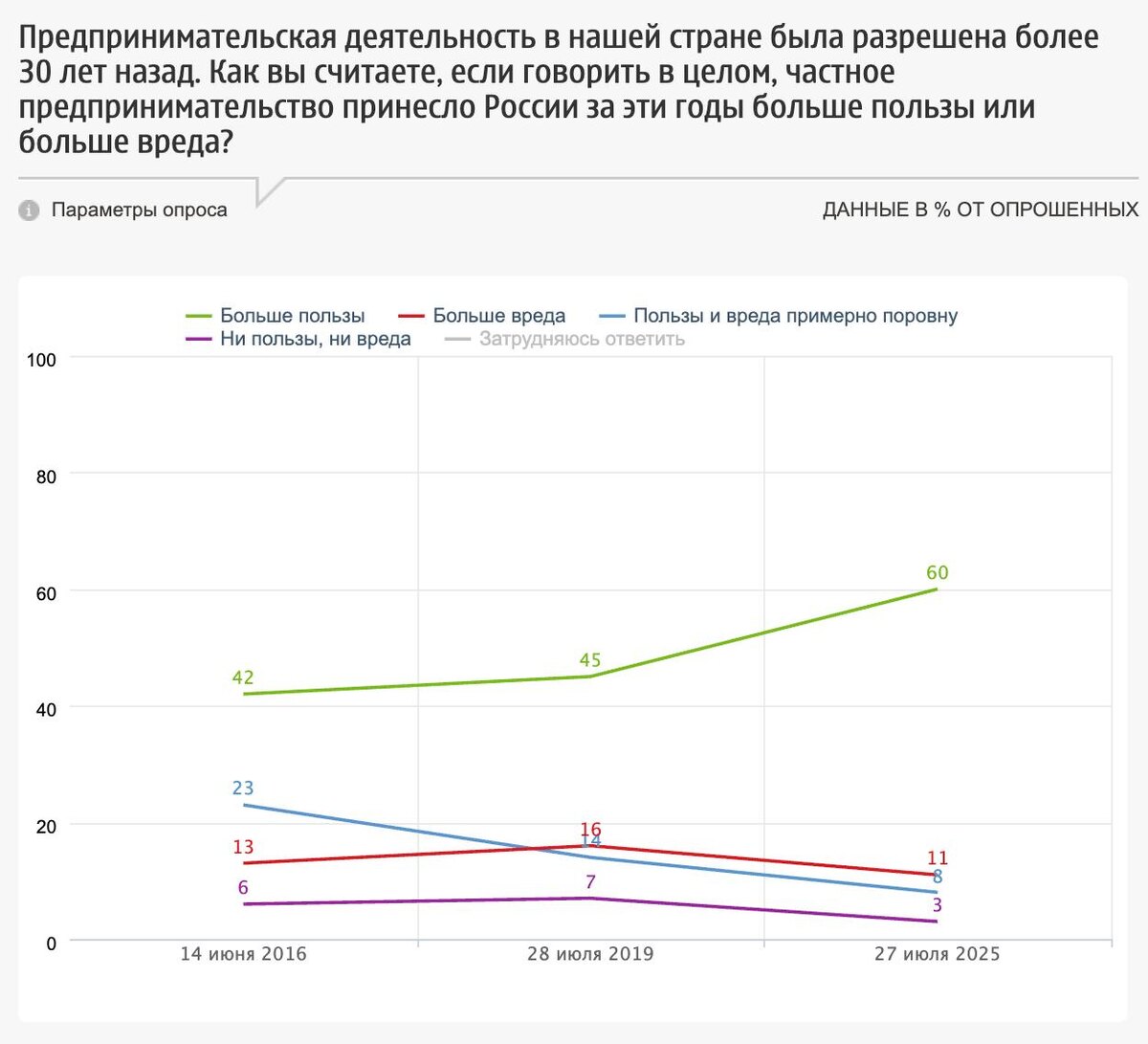 Частное предпринимательство существует в России уже более 30 лет. Большинство граждан (60%) считают, что оно принесло стране больше пользы, называя в качестве преимуществ расширение выбора товаров и услуг, создание рабочих мест и пополнение государственного бюджета. 11% респондентов полагают, что частный бизнес нанес больше вреда, указывая на рост цен и стремление предпринимателей к прибыли в ущерб интересам людей.