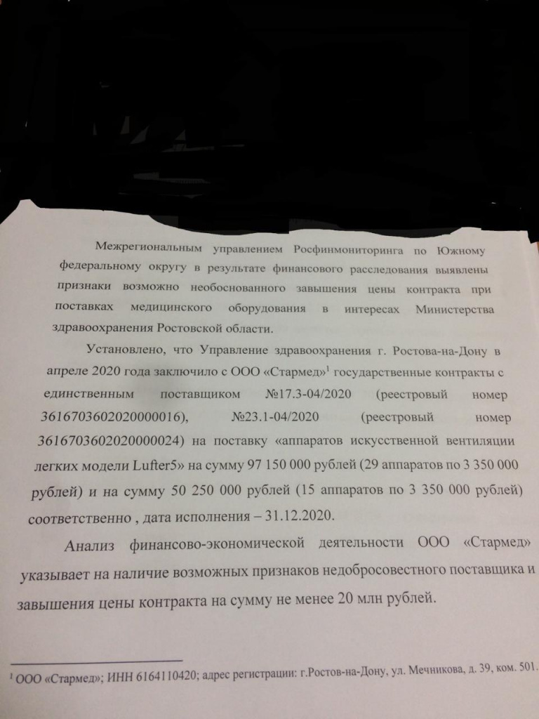 Еще в 2020 году управление Росфинмониторинга по Южному федеральному округу выявило признаки возможного необоснованного завышения цен контрактов при поставках медицинского оборудования в больницы Ростова.