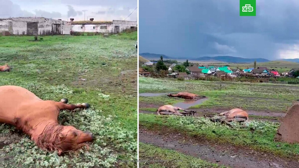 [ Смотреть видео на сайте НТВ ] Табун лошадей убило ударом молнии в башкирском селе Первое Туркменево, сообщает МЧС. Трагический инцидент произошел в селе Первое Туркменево Баймакского района.Там во время грозы молния ударила по табуну лошадей, которые паслись возле линий электропередачи. При ударе молнии погибли семь лошадей, которые принадлежали жителю села. [ Смотреть видео на сайте НТВ ]