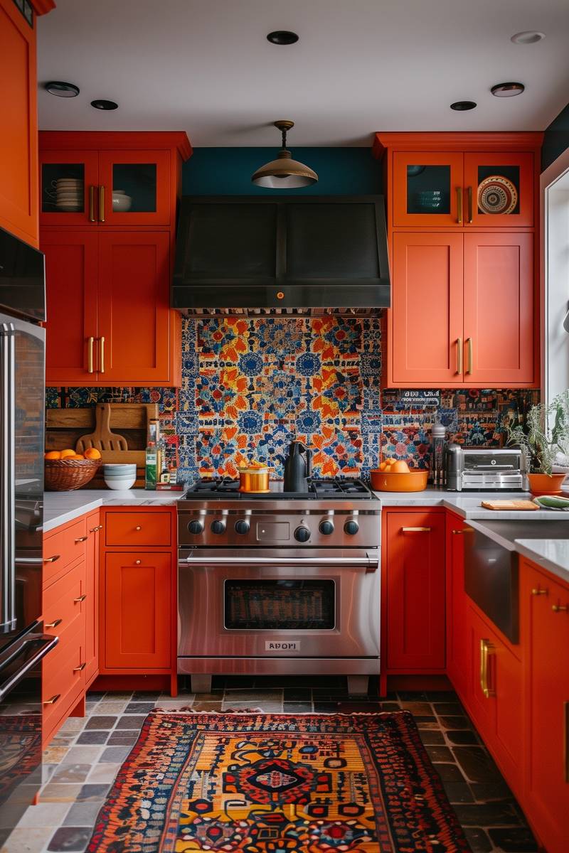 Ручное панно (tile mural) — в технике cuerda seca или hand-painting. Особенно выразительно выглядит над варочной поверхностью как декоративный центр всей кухни. Узоры — исламская геометрия, арабески, фестончатые арки. Цвета: охра, индиго, лазурь, темная мята. Это интерьерный storytelling, соединяющий кулинарию и ремесленную поэтику.