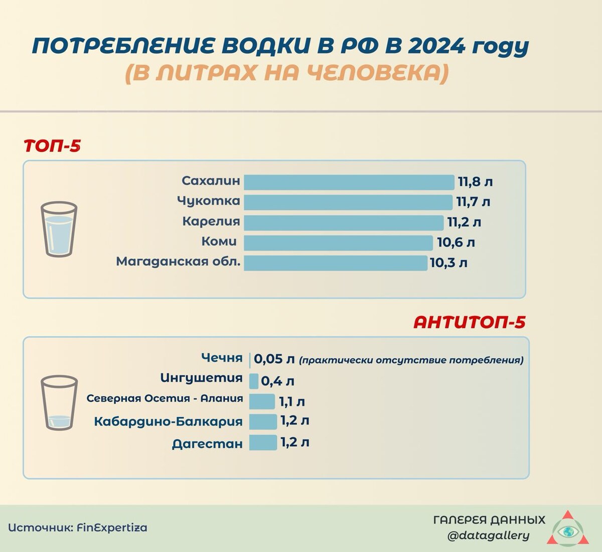 Северная Осетия держит аскезу в алкогольном портрете России Сегодня разбираем статистику потребления водки по регионам. По реализации водки, на которую приходится более 60% продаж крепкого алкоголя в стране. Лидеры рейтинга — северные регионы: • Сахалинская область — 11,8 литров на человека • Чукотский АО — 11,7 литров • Республика Карелия — 11,2 литров • Республика Коми — 10,6 литров • Магаданская область — 10,3 литра Регионы-аскеты: • Чеченская Республика — всего 0,05 литра • Республика Ингушетия — 0,4 литра • Северная Осетия — 1,1 литра • Кабардино-Балкария — 1,2 литра • Республика Дагестан — 1,2 литра Разница между лидером и аутсайдером — более 200 раз! Северные регионы показывают самые высокие показатели. На Кавказе практически не употребляют крепкий алкоголь. В европейской части России показатели средние. (@datagallery) Источник: FinExpertiza