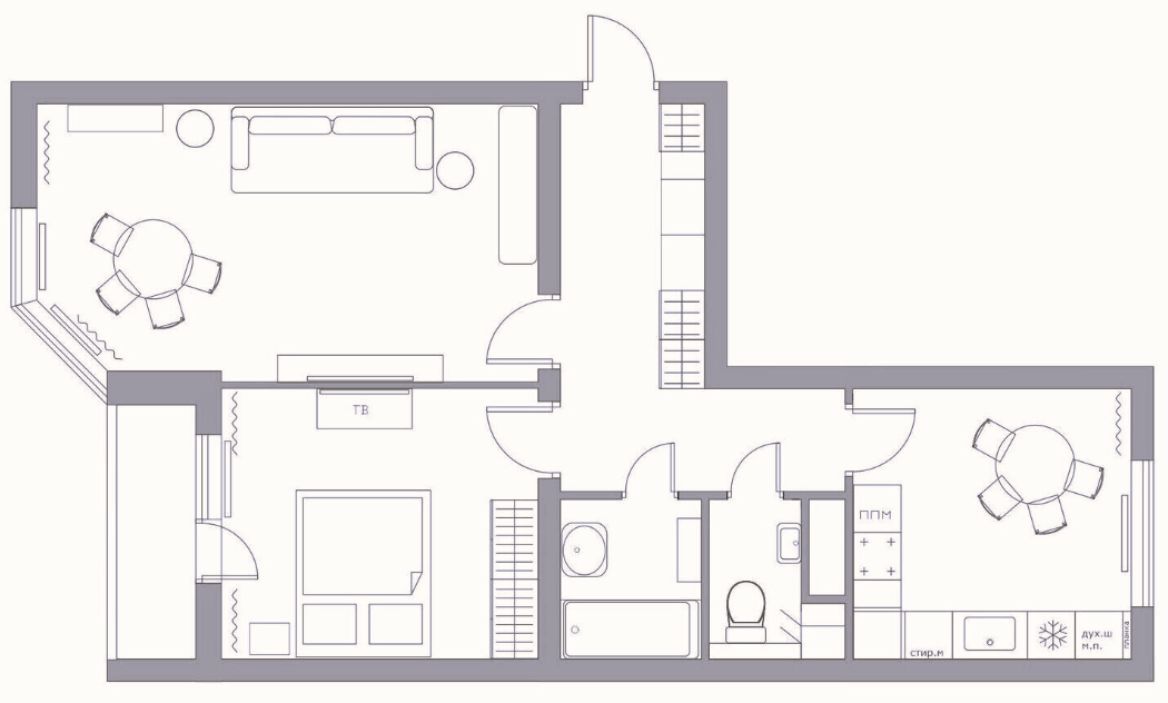Интересно, что перепланировка здесь даже не рассматривалась. Пространство было спроектировано идеально с самого начала: две комнаты, отдельная кухня и два санузла — всё отвечало нуждам пожилой женщины, была важна эргономика и логика пространства.