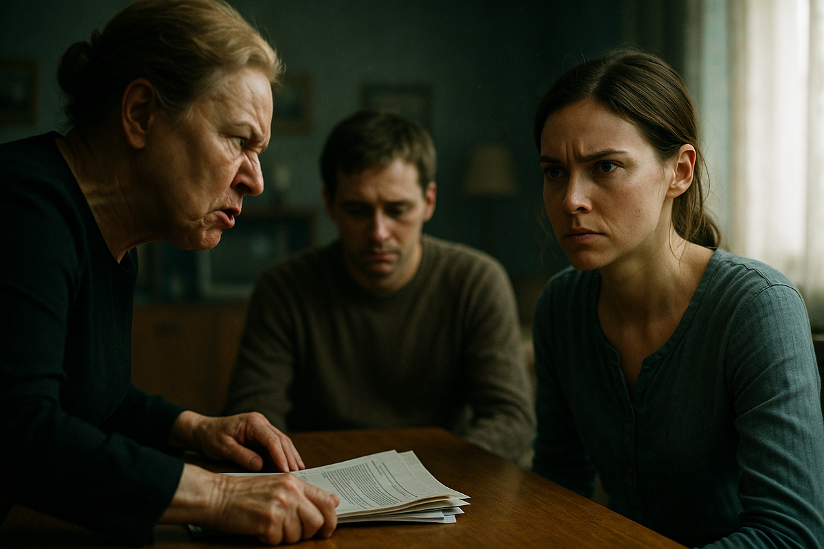 Вечером они сидели за большим круглым столом в гостиной. Воздух был тяжёлым, пахло валерьянкой и пылью. Таисия Ефимовна, вся в чёрном, положила перед собой пухлую папку с бумагами. Ульяна демонстративно смотрела в телефон, делая вид, что происходящее её не касается. Глеб сидел сгорбившись, глядя в одну точку.