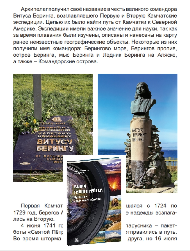 О командоре и открытых им островах с уникальным животным миром рассказывается в книге «Вадим Гиппенрейтер: «Природа — среда моего обитания» Марины Дороченковой и Анны Кравчук. Фрагмент из главы «Командоры»: «Командорские острова – это архипелаг из четырёх островов, образованных подводными вулканами. Побывать в этих краях – мечта каждого натуралиста-исследователя! Визитная карточка Командор – туманы. Они таинственным покрывалом окутывают прибрежные скалы-непропуски, будто стараясь скрыть трагические события прошедших лет. Здесь даже географические названия – словно страницы из книги об истории России.