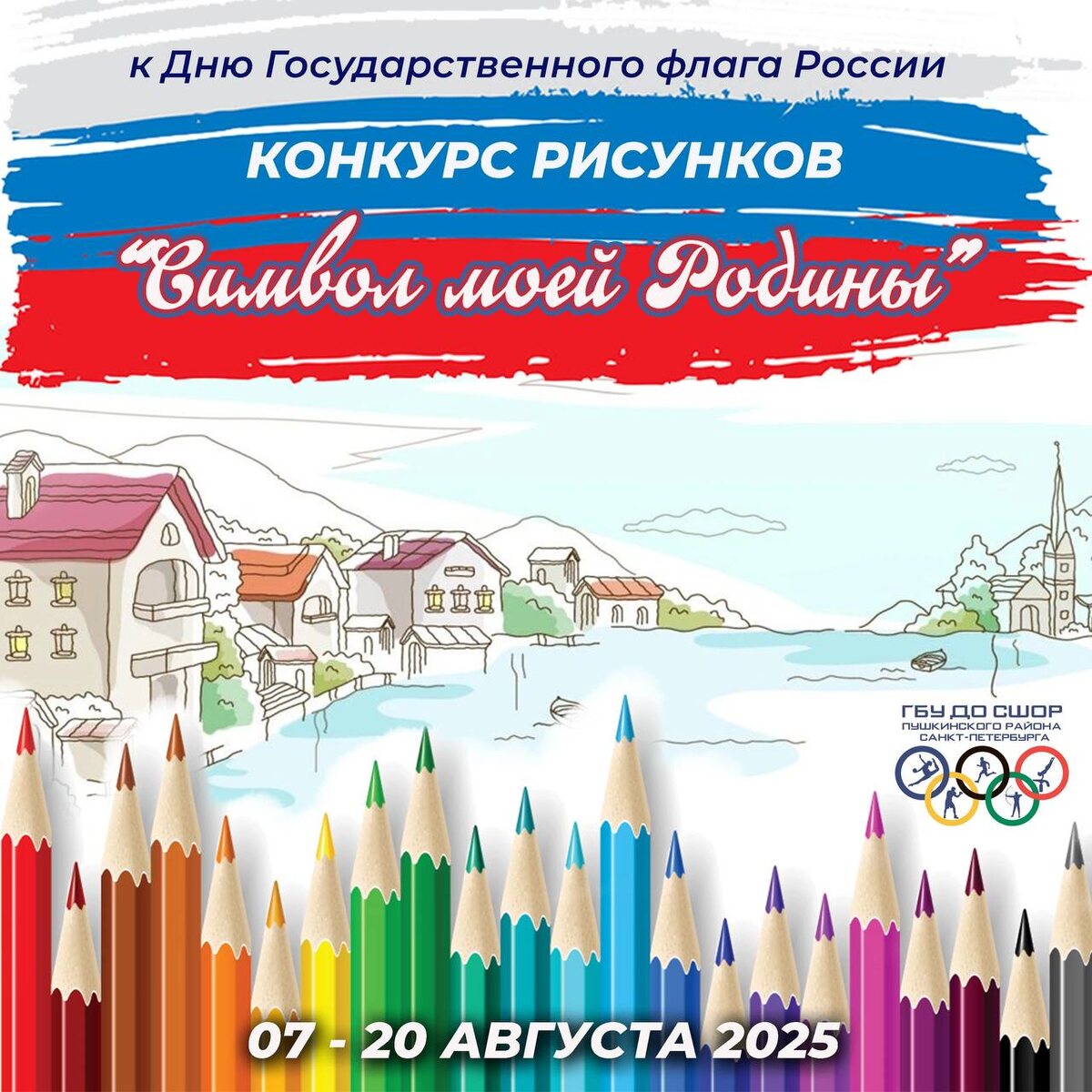 🎨КОНКУРС РИСУНКОВ "СИМВОЛ МОЕЙ РОДИНЫ" ✏️Наши творческие спортсмены - мы к вам! В нашей спортивной школе проходит конкурс рисунков, приуроченный к Дню Государственного флага России. К участию приглашаются все воспитанники СШОР Пушкинского района Санкт-Петербурга. 🇷🇺Государственный флаг – это не только олицетворение истории, культуры и духа нашего народа, но и священный символ единства, суверенитета и несгибаемой воли нации. Именно флаг первым водружают наши герои-воины, поднимают на высочайших вершинах мира, в глубинах космоса, на ступенях спортивных пьедесталов, на передовых рубежах науки и технологий. Требования к оформлению работ: ✔️рисунки, плакаты на бумаге формата А4 или А3; ✔️выполнение в любой художественной и графической технике (гуашь, акварель, тушь, коллаж, аппликация, цветные карандаши и т.п., либо смешанные техники); ✔️создавайте работы, посвященные флагу России ℹ️Прием работ осуществляется в период с 07 по 20 августа 2025 года. ✍️Готовые работы необходимо подпис