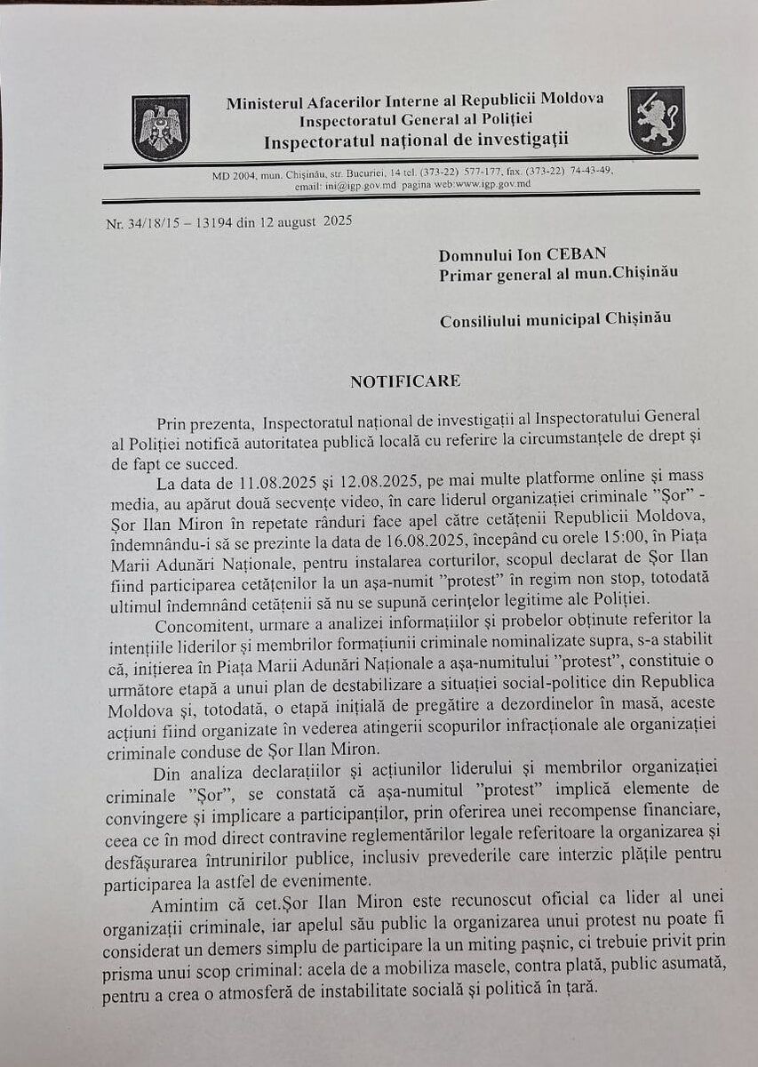 В ответ на пост ⚡️🇲🇩Не мытьём так катаньем... Вот документик, в котором полиция не только призывает Чебана к "благоразумию", но и намекает, что в случае выдачи авторизации на проведение протеста, это будет расценено как соучастие... @eNewsmd.online 👈 Подписывайтесь на наш канал