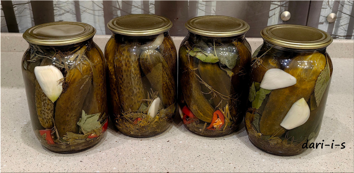 Этот рецепт я позаимствовала из книги "Вкусная консерватория" Инны Метельской-Шереметьевой (блогер DiDinfo). Точнее, взяла её рецепт за основу, внеся свои предпочтения в плане растительных специй. И осталась очень довольна. Готовлю не первый год, всегда съедаются. Солёненькие, в меру острые, хрустящие огурчики, одно удовольствие! Не сложный совсем рецепт, получаются с первого раза. Нам потребуются: На каждую литровую банку: Рассол на 1 л воды: Огурцы моем и замачиваем в холодной воде на 3-4 часа. Большую часть приправ (кроме водки) укладываем на дно чистых банок. Закладываем огурцы "стоя", сверху засыпаем оставшиеся специи (кроме водки), докладываем огурцы сверху. Заливаем кипящим рассолом. Закрываем обычными пластиковыми крышками и ставим в глубокий противень (будут "бродить") на 3-5 дней при комнатной температуре (лучше в самой прохладной комнате). У меня, на юге, довольно жарко и мне хватает 3 дней. Сверху должна появиться небольшая пена, а рассол помутнеет и станет кисловатым на вк
