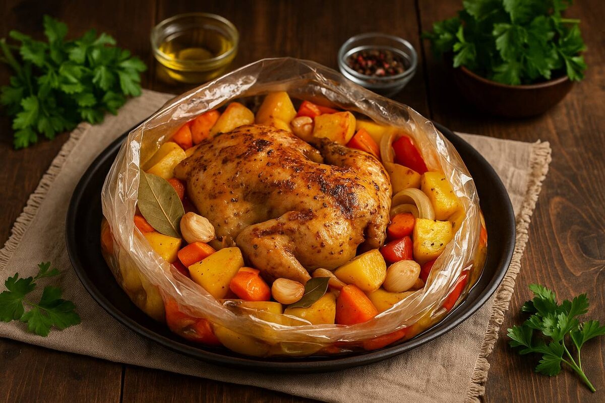 6. Подача. Разрежьте рукав аккуратно, чтобы не обжечься паром, и подавайте сразу, пока мясо сочное, а овощи ароматные.