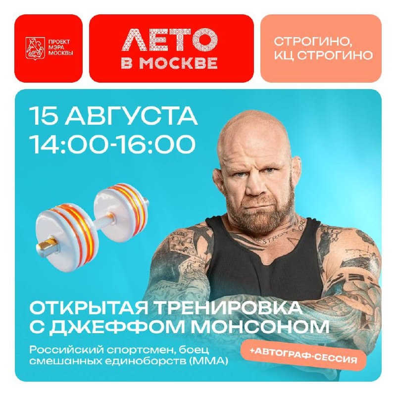 Анонс мероприятия: Открытая тренировка с Джеффом Монсоном в Строгино! 15 августа с 14:00 до 16:00 в Культурном центре "Строгино" (Москва) состоится уникальная открытая тренировка с легендой смешанных единоборств — Джеффом Монсоном! 🔹 Участники смогут: - Познакомиться с техникой и опытом известного российского спортсмена и бойца MMA. - Получить ценные советы и потренироваться под его руководством. - Участвовать в автограф-сессии и лично пообщаться с Джеффом. 📍 Место: КЦ "Строгино", Москва. ул. Маршала Катукова д.8 ⏰ Дата и время: 15 августа, 14:00–16:00. Не упустите шанс провести день с одним из самых известных бойцов MMA! #Монсон #MMA #Строгино #Тренировка #Москва #летовмоскве
