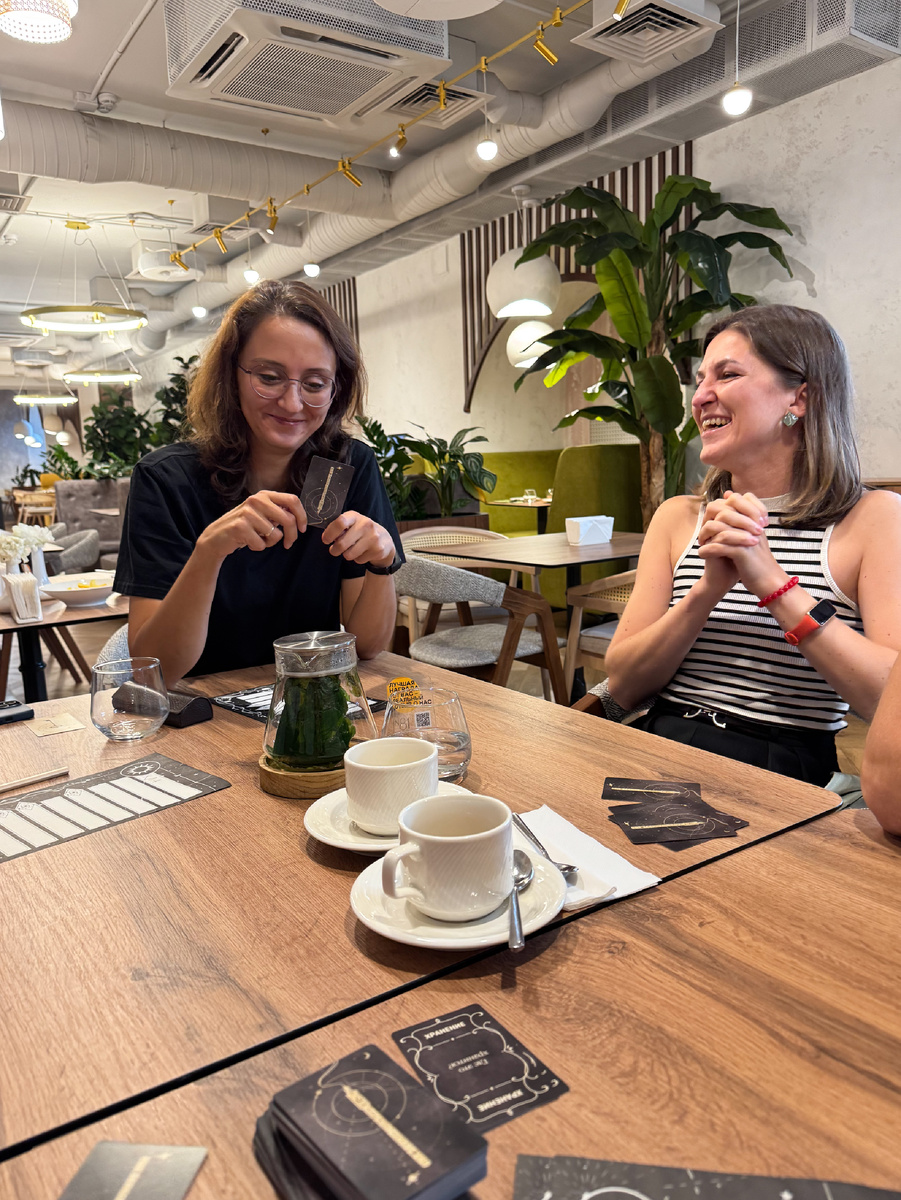 Патигеймы хороши тем, что в процессе действительно весело, но плохи тем, что ты весь в игре и не успеваешь фотографировать — а тем более сам попадать в кадр:) «Призрачные чернила» — игра, с которой я познакомилась ещё давно на УИКемпе благодаря Тимуру, и партия получилась очень весёлой, поэтому я крайне обрадовалась, когда «Лавка игр» взяли игру на локализацию. ПРАВИЛА Раз это пати, правила должны объясняться на раз-два, и в «Чернилах» это близко к истине. Игроки делятся на две команды (луны и солнца), каждая команда выбирает ведущего. Оба ведущих получают слово (одинаковое для них обоих), которое они должны объяснить своим партнёрам по команде. В свой ход команда выбирает из 7 вопросов на руке 2 карточки с вопросами для своего ведущего. Например, «для чего это используется» и «с каким предметом это схоже по размеру». Ведущий выбирает один вопрос, на который он будет отвечать (соперники вопрос не видят), и начинает писать по одной букве в строке ответа, пока его команда не скажет: «Сто