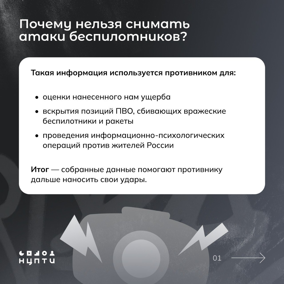 В Ростовской области с 11 августа действует запрет на фото- и видеосъемку атак беспилотников. Нарушителям грозит штраф от 3 тысяч рублей. Подобные меры действуют и в других регионах. В карточках разъясняем, с чем это связано и что делать в ситуации атаки дронов в первую очередь. 🌐 НЦПТИ