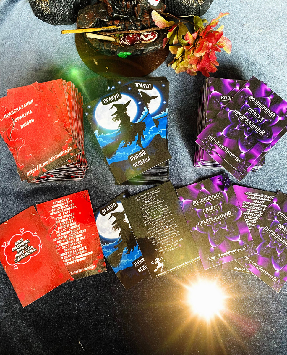 Мои Авторские Колоды Карт,Оракулы🔮 Доброго Времени Суток🌞 Представляю Вашему Вниманию ,Мои Три Авторские Колоды Карт . Первая Колода.🔮 АВТОРСКАЯ КОЛОДА КАРТ «ПРЕДСКАЗАНИЯ ОРАКУЛА ЛЮБВИ».❤️🔮 80-КАРТ ЭТОТ ОРАКУЛ СОЗДАН ДЛЯ АНАЛИЗА ОТНОШЕНИЙ. ОН ДАСТ ОТВЕТЫ НА ВОЛНУЮЩИЕ ВОПРОСЫ, ПОДСКАЖЕТ ВЕРНОЕ РЕШЕНИЕ В ЛЮБОВНЫХ ДЕЛАХ. ЭТОТ ОРАКУЛ ПРИОТКРОЕТ ДВЕРЬ В БУДУЩЕЕ И СТАНЕТ ВАШИМ ХОРОШИМ ПОМОЩНИКОМ И СОВЕТЧИКОМ. Вторая Колода.🔮 «ВОЛШЕБНЫЙ ОРАКУЛ ПРЕДСКАЗАНИЙ»🪄🔮 80 КАРТ ЭТОТ ОРАКУЛ ПОМОЖЕТ ВАМ ПОЛУЧИТЬ ОТВЕТЫ НА ВОЛНУЮЩИЕ ВОПРОСЫ,РАСКРОЕТ ТАЙНЫ БУДУЩЕГО, РАССКАЖЕТ О ГРЯДУЩИХ ЖИЗНЕННЫХ СОБЫТИЯХ, ПРЕДОСТЕРЕЖЕТ ОТ ОПАСНОСТЕЙ,С КОТОРЫМИ ВЫ МОЖЕТЕ СТОЛКНУТЬСЯ НА СВОЕМ ЖИЗНЕННОМ ПУТИ. ЭТОТ ВОЛШЕБНЫЙ ОРАКУЛ ПОДОЙДЕТ КАК ДЛЯ ПРАКТИКОВ, ТАК И ДЛЯ НОВИЧКОВ. ЭТОТ ВОЛШЕБНЫЙ ОРАКУЛ ОКАЖЕТ ВАМ ПОДДЕРЖКУ, СТАНЕТ ВАШИМ СПУТНИКОМ и ПОМОЩНИКОМ. Третья Колода.🔮 АВТОРСКАЯ КОЛОДА КАРТ ОРАКУЛ ПРЕДСКАЗАНИЙ ЛУННОЙ ВЕДЬМЫ🧙♀️🔮 80 KAPT ЭТОТ ОРАКУЛ СОДЕРЖИТ ПРОСТЫЕ И ДОСТУПНЫЕ ДЛЯ ПОНИМАНИЯ ПРЕДСКАЗАНИЯ,КОТОР