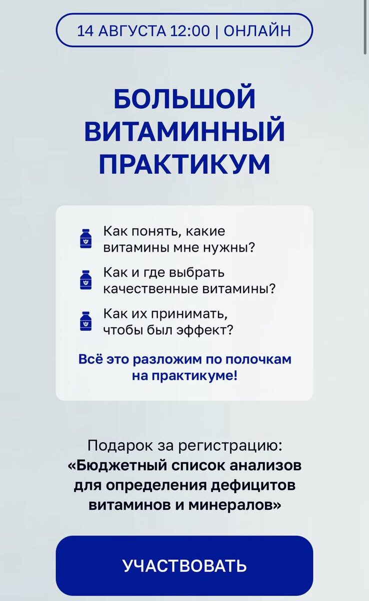 Отвечаю на вопросы и параллельно готовлю для вас встречу по витаминам. Самое сложное - всё уместить в 2 часа, столько всего хочется рассказать!🔥 📅 Напомню, что практикум будет в четверг 14 августа в 12:00 по Мск. Если вы ещё не зарегистрировались, то сделайте это сейчас 👉 https://clck.ru/3NZ3De Программу я выстраиваю таким образом, чтобы у вас остался готовый алгоритм действий✅ 1️⃣ Как понять, какие витамины вам нужно пить (как подобрать по симптомам и анализам) 2️⃣ Как выбрать витамины (формы, дозировки, производитель) и где их заказать 3️⃣ Как принимать витамины, чтобы действительно был эффект (график приема и совместимость) 4️⃣ Как отслеживать результаты и корректировать прием при необходимости Моя команда мне сегодня сказала, что в других школах такие практикумы стоят от 10 тыс, а я бесплатно провожу😅 А мне не жалко! Главное, чтобы вы не только послушали, но и внедрили в жизнь знания💛 Так что буду вас очень ждать! А пока пройдите регистрацию и заберите первый подарок