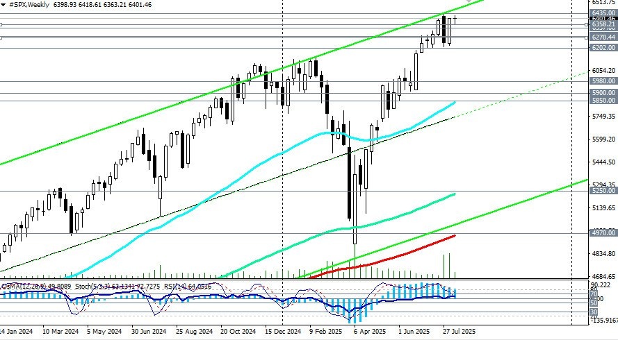 https://basechop.ru/wordpress/?p=53692 Итак, американские индексы CPI и базовый CPI выросли в июле на +0,2% и +0,3%, соответственно. При этом, годовой базовый индекс CPI вырос на +3,1%, после роста на +2,9% в июне при прогнозе в +3,0%, а общий годовой CPI сохранил темпы роста, составив +2,7%, также как и в июне. Несмотря же на сохранение инфляционного давления, доллар снизился сразу после публикации индексов CPI. При этом фьючерсы на основные американские фондовые индексы подскочили в цене, протестировав максимумы прошлой недели. Так, индекс S&P500 пробил максимум августа и обновил 8-дневный максимум, поднявшись выше отметки 6418.00. Основной сценарий, предложенный нами в сегодняшнем обзоре «S&P500: индексы CPI. Что дальше?» частично сработал: цена пробила вчерашний максимум 6406.00. Несмотря на то что через некоторое время после публикации индексов CPI начался откат на рынке, все же потенциал для дальнейшего роста S&P500, с технической точки зрения, сохраняется, учитывая также тот
