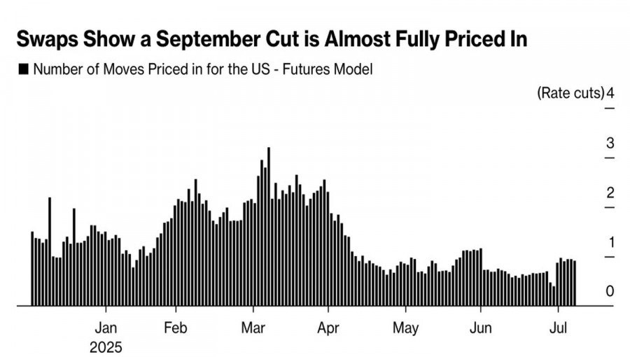 Деривативы уверены в снижении ставки по федеральным фондам на 25 б.п до 4,25% в сентябре и ожидают увидеть три акта монетарной экспансии до конца 2025. Главным препятствием на пути ФРС становится инфляция. Разгон базового индикатора с 2,9% до 3,1% и ставшие на якорь на отметке 2,7% потребительские цены являются веским аргументом в пользу сохранения паузы в цикле монетарной экспансии ФРС.