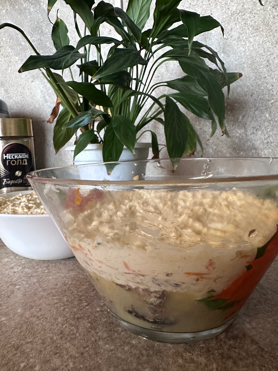 Давно уже хотела начать публиковать и семейные рецепты тоже. Так почему бы не сейчас?! Этот рецепт - один из любимых в нашей семье. Салат готовится быстро, а вкус нежный и вдохновляющий. Потребуется: 🥤 Майонез 🥚 3 яйца 🥔 3 картошки среднего размера 🥕 2 морковки среднего размера 🐟 Баночка рыбных консерв (у меня это натуральная тихоокеанская сайра с добавлением масла фирмы ДОБРОФЛОТ) Яйца (желтки отдельно, белки отдельно), картошку и морковку сварить, остудить и потереть на мелкой тёрке, консервы потолочь, чтобы были не кусками и приятно ласкали ротовую полость при употреблении 🤪 Выкладываем слоями: 🥔 Тонкий слой картошки (можно посолить) 🐟 Сверху слой толченой рыбы из банки 🥔 Снова слой картошки, можно посолить и промазать майонезом 🥕 Слой тёртой морковки (солим, промазываем майонезом) 🥚 Слой тертого белка он вареных яиц (солим, промазываем майонезом) 🍳 Сверху тертый желток (я обычно не тру, просто размельчаю руками, но тут кому как удобнее) - желток можно не промазывать