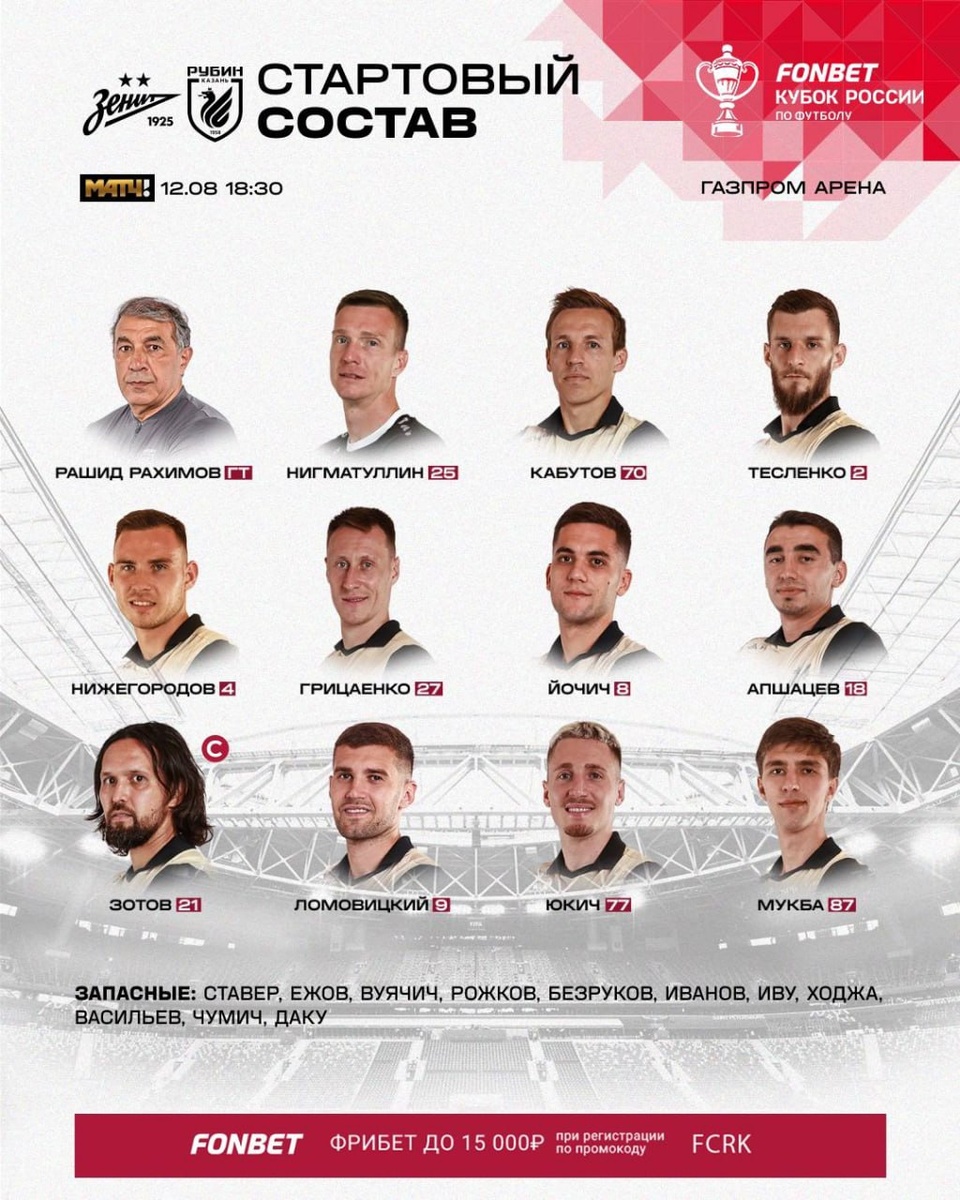 ...снова не в составе Рубина. Зато, кажется, мы сыграем в 4 защитника. Интересное решение Рахимова. Или же Мукба или Ломовицкий слева в защите 🥲 ❤️ Злобный Рубин ❤️