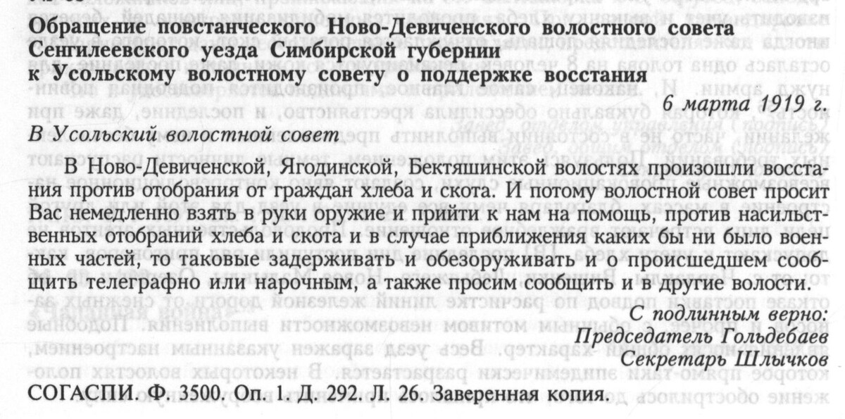 Сызрань. На экстренном заседании уисполкома заслушано сообщение председателя уисполкома Р. Э. Зирина о переговорах по прямому проводу с председателем Симбирского губисполкома М. А. Гимовым. Последний сообщил о начавшемся контрреволюционном мятеже в с. Новодевичье Сенгилеевского уезда. По сведениям разведки, брожение начинается и в Ставропольском районе Самарской губернии. Гимов просил передать об этом Самарскому губисполкому.