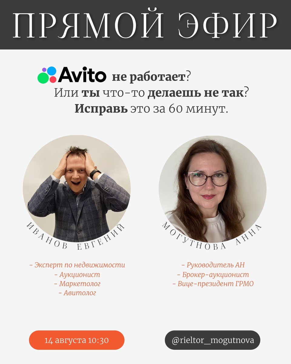 🤍Авито не работает? Или ты что-то делаешь не так? Исправь это за 60 минут! Дорогие подписчики! 14 августа в 10:30 у нас состоится прямой эфир! Спикеры: Могутнова Анна и приглашенный гость — эксперт по недвижимости, маркетолог и авитолог, Иванов Евгений. 🎤 Если вы когда-либо сталкивались с проблемами при размещении объявлений на Авито или не получали ожидаемого отклика, этот эфир для вас! Евгений поделится с нами своими секретами и проверенными методами, которые помогут вашему объявлению выделяться на фоне конкурентов. 🔑 🤔 Чем будет полезен наш эфир? • Узнаете, какие ошибки чаще всего допускают пользователи при размещении объявлений. • Получите практические советы по созданию привлекательного контента. • Познакомитесь с эффективными стратегиями продвижения ваших предложений. • И самое главное — сможете задать свои вопросы и получить на них ответы от настоящего профессионала! Не упустите возможность прокачать свои навыки и сделать ваши объявления успешными! 💬 Задавайте свои в