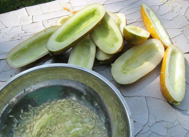 Разрезаю плод вдоль, вынимаю семена ложкой, промываю в воде, отбирая только полновесные, затонувшие семена. Пустые всплывают – их сразу выбрасываю.