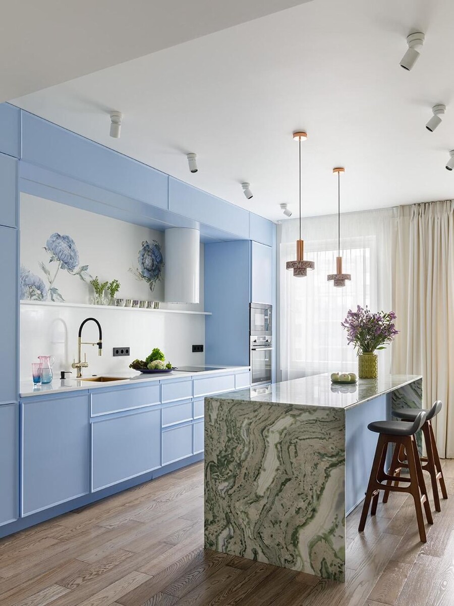 Мраморный фартук — идеальный фон для неоклассики, итальянского шика и сдержанного люкса. Важно не перегрузить — такой фартук сам по себе уже акцент.