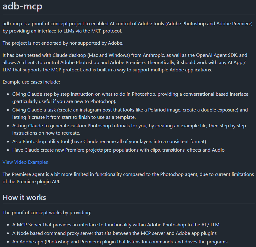 adb-mcp — это мощный MCP-сервер с открытым исходным кодом, разработанный Майком Чамберсом, который позволяет управлять профессиональными инструментами Adobe — такими как Photoshop, Premiere Pro и InDesign — с помощью искусственного интеллекта (Claude, OpenAI и других решений, поддерживающих Model Context Protocol). Несмотря на отсутствие официальной интеграции со стороны Adobe, проект успешно протестирован и уже способен выполнять широкий спектр задач в креативных приложениях. * Поддержка нескольких приложений Adobe: * Photoshop — полное управление: удаление и замена фона, цветокоррекция, перемещение, распределение и автоматическое именование слоёв по содержимому, перевод документов, правка вёрстки, добавление объектов с реалистичной подгонкой света и теней. * Premiere Pro — базовые возможности видеомонтажа (с учётом того, что UXP-API ещё в бета-версии). * InDesign — работа с макетами, текстами и графикой. * Управление голосом или текстом: команды ИИ на естественном языке автоматически