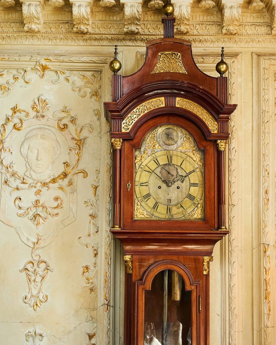 Зал «Библиотека» в деталях: английские напольные часы с механизмом Joseph Rose & Son, середина XVIII века. В конце XVII века новый часовой механизм обеспечил точность хода, а удлиненная конструкция с гирями потребовала высокого корпуса — так сложился силуэт, который сейчас вы видите на фотографиях. Если присмотреться к нашим, на циферблате подпись Joseph Rose & Son, London; над «VI» — маленькое окошко даты; в арке — диск Strike/Silent, которым в домах отключали бой на ночь или во время чтения. Два отверстия для ключа означают восьмидневный ход: раз в неделю часы заводят, и маятник снова задает ритм. Рассмотреть циферблат вблизи можно в зале «Библиотека», в правом эркере. Забронировать стол