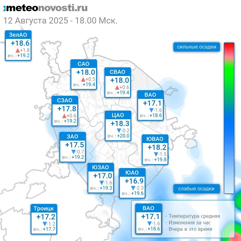 В 18:00 в Москве было от +16.5°C до +19.7°C, средняя температура +17.8°C #погода #Москва #лето #температура #12августа #вторник