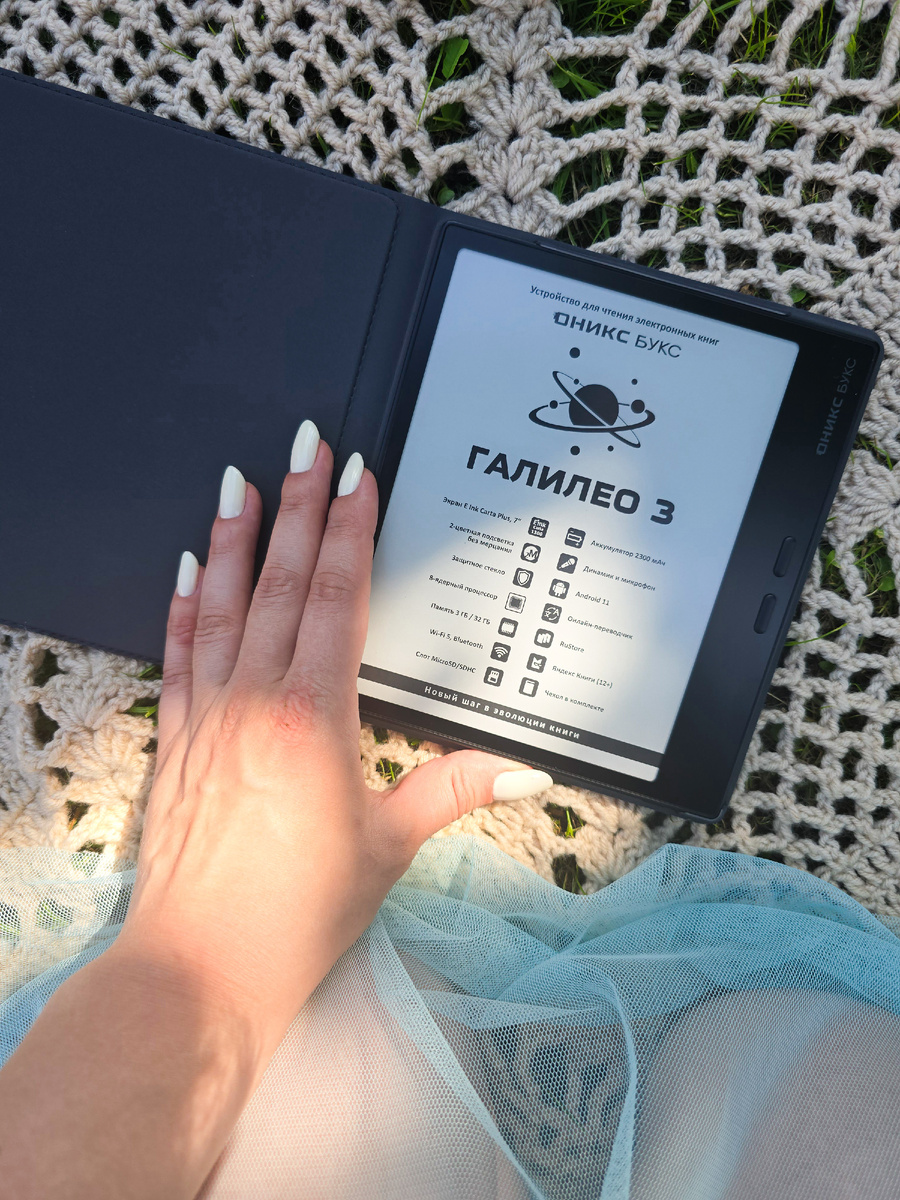 Вот уже месяц пользуюсь своей новенькой электронной книгой Оникс Бук Галилео 3🥰 Это просто любовь! Я с ней не расстаюсь! 7 дюймов чистого удовольствия для глаз, мягкая подсветка, отсутствие мерцания, удобный вес и боковые кнопки для перелистывания. Беру её с собой везде: на кухню с чашкой кофе, в постель перед сном, на лавочку в парке, в поездку. Это первая моя книга с таким большим экраном. Я переживала, что будет неудобно держать её в руке, но всё оказалось наоборот. Она ещё лучше легла мне в руку, очень комфортно перелистывать страницы, даже одной рукой. Экран ONYX Glass больше устойчив к повреждениям и практически не бликует. Книгу я не заряжала месяц и заряд ещё держится🔥 8-ядерный процессор и 3 ГБ ОЗУ - быстрый отклик, плавное перелистывание страниц. И да, кстати, книга на Android, поэтому можно ставить приложения из Google Play. Экран с подсветкой Moon Light 2 с регулировкой цветовой температуры - можно подобрать тёплый или холодный цвет. Благодаря экрану E Ink Cart