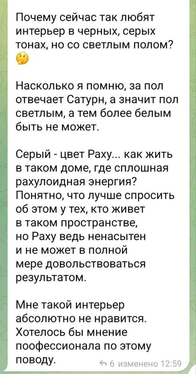 Здесь, конечно, не один вопрос, а целая совокупность. Но давайте попробуем по порядку. Почему сейчас так любят черно - серые интерьеры, но со светлым полом. Раху. Вообще то, что цвет Раху - серый- очень неоднозначное утверждение. Описание этой теневой планеты в разных текстах приводят в подобие дыму не потому, что он настолько же сер, как дым. А потому что настолько же иллюзорен и не имеет формы. Есть тексты, где сказано, что Раху подобен грозовой туче. ✅Из-за этого некоторые астрологические школы принимают его цвет иссиня-фиолетово-черным. Но при этом упускают опять же не его явные видимые качества. А те ощущения, которые мы испытываем при надвигающейся на нас непогоде, несущей и страх не известного, и опасность, непредсказуемость событий. А есть описание Раху как того, что он не только не имеет определённой формы. Он же не материальная планета. Но и то, что он не имеет цвета. «Раху не имеет формы. Его цвет — это цвет вашего страха. Укротите ум — и тьма станет светом» ✨Та