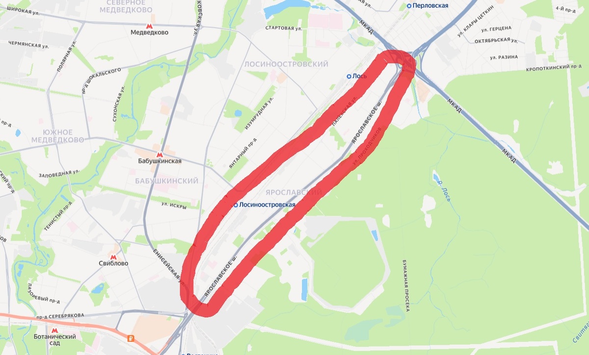 Сначала столичные власти решали проблемы южной части Москвы. Соединили Западное и Восточное Бирюлёво. Построили Очаковский путепровод. А вот что касается северо-востока, то с Ярославского шоссе по-прежнему нет проездов к западу аж от Северянинского путепровода до МКАД. Расстояние там почти 5 с половиной километров. Жители Ярославского района фактически обитают в анклаве. Они зажаты между путями Ярославской железной дороги на западе и огромным лесным массивом Лосиный остров на востоке.
