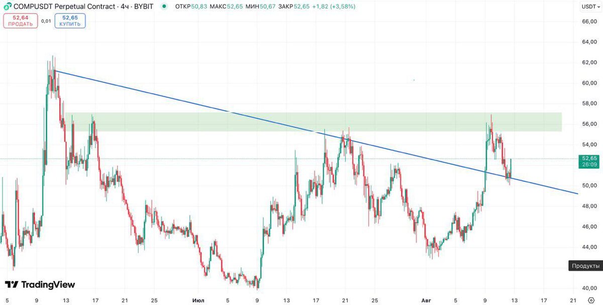 COMP Как вы видим на графике, цена пробила нисходящую линию тренда и сделала ретест этой зоны. Можно неплохо поднабрать актив в этих значениях, с целью прихода в зону зеленого прямоугольника 😈