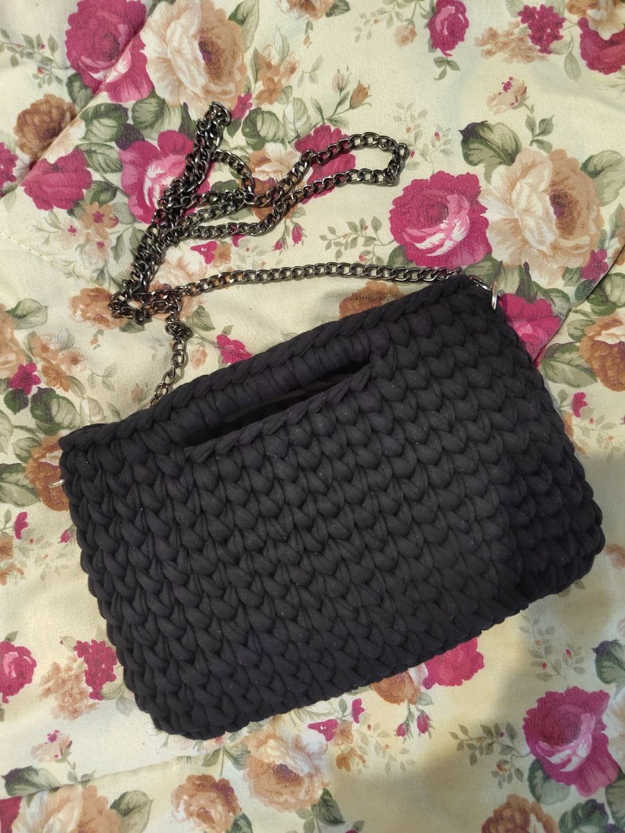 Всем привет! Хотела вам рассказать про эту сумочку, связала её ещё в апреле, и я вам скажу, я ее ношу и очень даже часто, такой она оказалась удобной. Я делала её без каких-либо замков, максимум, что я бы туда добавила, — это кнопку, но мне и так очень удобно ей пользоваться, не нужно что-то открывать постоянно. Я вообще люблю такие маленькие сумочки. У меня в неё входит: телефон, паспорт, я беру ещё накладки для туалета для ребенка, ключи от машины и наушники. В общем, я очень довольна.