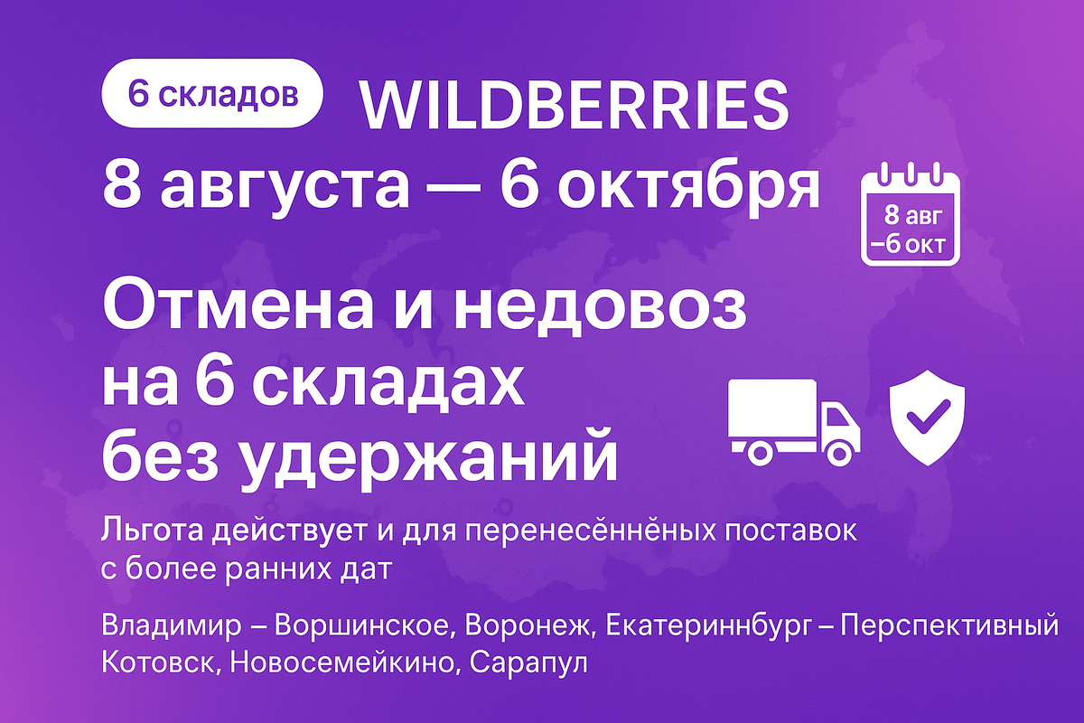С 8 августа по 6 октября действуют послабления: Wildberries не штрафует за отмену или недовоз поставок на шесть конкретных складов. Льгота распространяется даже на те поставки, которые вы перенесли на эти даты с более ранних. Это редкая возможность безболезненно корректировать план, тестировать ассортимент и работать с рисковыми партиями.