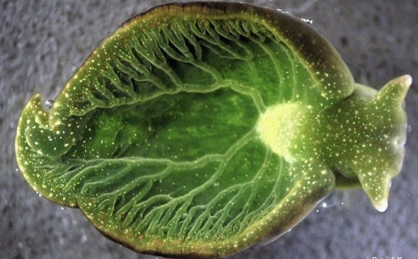 2. **Встраивает их хлоропласты** – вместо того чтобы переваривать их, слизень сохраняет хлоропласты в своих клетках.