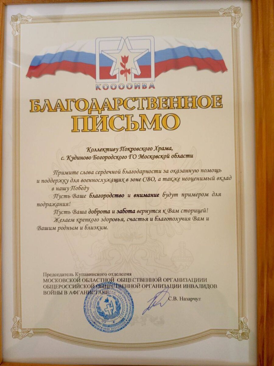 Организация инвалидов войны в Афганистане выразила благодарность волонтёрам группы «Кудиновский Покров» Группа волонтёров «Кудиновский Покров», действующая при Покровском храме села Кудиново Богородского городского округа, была награждена благодарственным письмом Купавинского отделения Московской областной общественной организации инвалидов войны в Афганистане. Награда вручена за активную помощь и поддержку военнослужащих в зоне проведения специальной военной операции и за значимый вклад в общее дело. Организация отметила благородство, внимание, доброту и заботу волонтёров, которые являются примером для подражания. Между Покровским храмом и купавинскими волонтёрами давно сложились добрые взаимоотношения: стороны обмениваются необходимой поддержкой, помогая друг другу ресурсами для решения актуальных задач и нужд СВО. Вручение благодарственного письма стало важным признанием общих усилий и ещё раз подчеркнуло значимость взаимовыручки и сотрудничества для общего дела.
