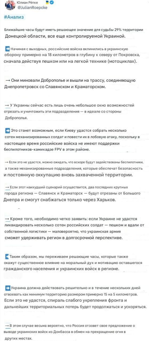 Однако информационная волна «зрады» докатилась до западных СМИ. Юлиан Репке рисует страшные картины для ВСУ (переведено с немецкого), но нужно учитывать, что в прорыв шли малые группы, и для развития успеха нужно время.